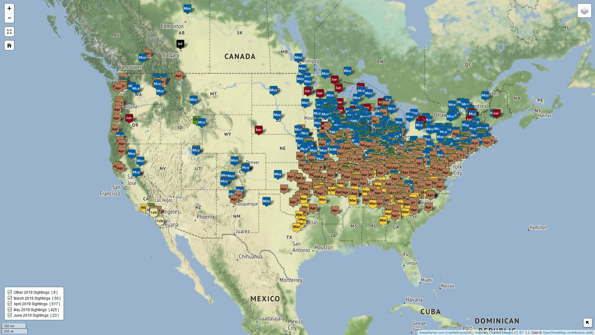The great morel, a website dedicated to everything morel related, has an interactive sighting map that covers the entire united states and southern canada.